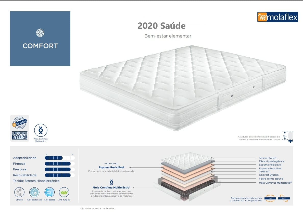 Tecnologia Multielástic® (Gama Saúde) Sistema de molas contínuas com duas zonas de firmeza diferenciadas. Esta tecnologia, reconhecida pela sua excelência na gama saúde, oferece uma estabilidade superior e um suporte ortopédico de confiança.
